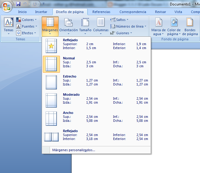 Margenes: En la pestaña Diseño de página, haga clic en Márgenes.Despues haga clic en el tipo de margen deseado, todo el documento cambiará para utilizar el tipo de margen seleccionado.También puede utilizar su propia configuración de márgenes, haga clic en Márgenes, después en Márgenes personalizados y, a continuación, en los cuadros Superior, Inferior, Izquierdo y Derecho, escriba los nuevos valores de los márgenes.